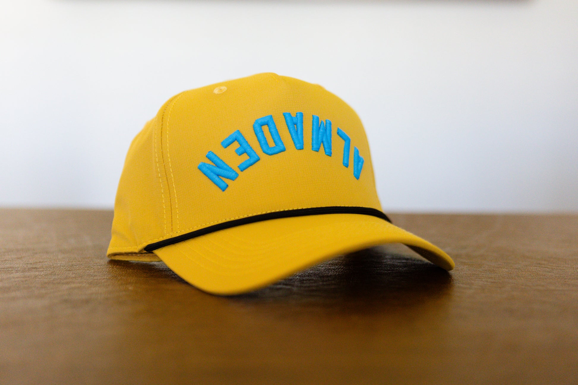 Almaden Dijon Rope hat With Blue Neon lettering